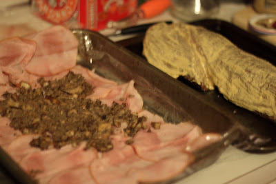 4.) Prepare the first stage of the Beef Wellington wrap.  Layout a large sheet of plastic wrap and cover with ham so that your slices overlap.  Spread mushroom over the ham slices and beef fillet on top of these two layers.  Pause to spread djon mustard fully over the entire fillet.  Then, roll the ham and mushrooms over the fillet and use the plastic wrap layer to tightly seal your rolled ham-mushroom-fillet bundle.  Ensure that your plastic wrap is tight by using rubber bands to secure the ends, and refrigerate for 20 minutes.  Remove puff pastries from the freezer/fridge and allow to defrost for these 20-30 minutes.