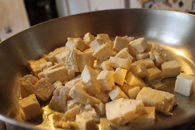 4.) Heat a large frying pan or wok. Add 1 tablespoon of cooking oil and coat pan. Add tofu and spread evenly to coat and cook. Fry each side until golden brown. Remove tofu from pan.