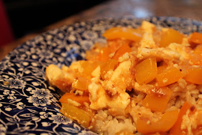5.) Add the remaining tablespoon of oil and add peppers and ginger. Fry for 1 minute. Add pineapple chunks and whisked mixture from above (the “sweet and sour sauce”). Turn heat to medium-high and add tofu. Allow sauce to simmer and cook until ingredients are all tender and browned, but still retain their “crisp” (I’m speaking specifically of the peppers here).