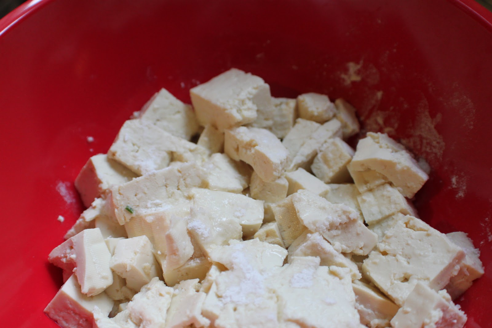 2.) Then, begin by marinating the tofu. Combine tofu, egg white, corn starch, and salt. Coat evenly and allow to marinate for 15 minutes, but can marinate in the refrigerator for “up to overnight.”