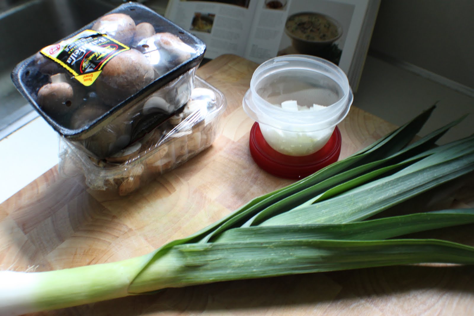 1.) First, measure out all of your ingredients–mushrooms, onions, garlic, and leeks.