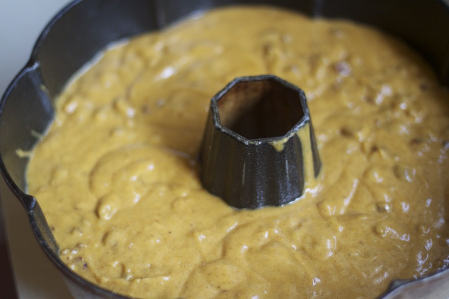 4.) Finally, add nuts (optional) and pour into a well-sprayed baking sheet, or bundt pan.